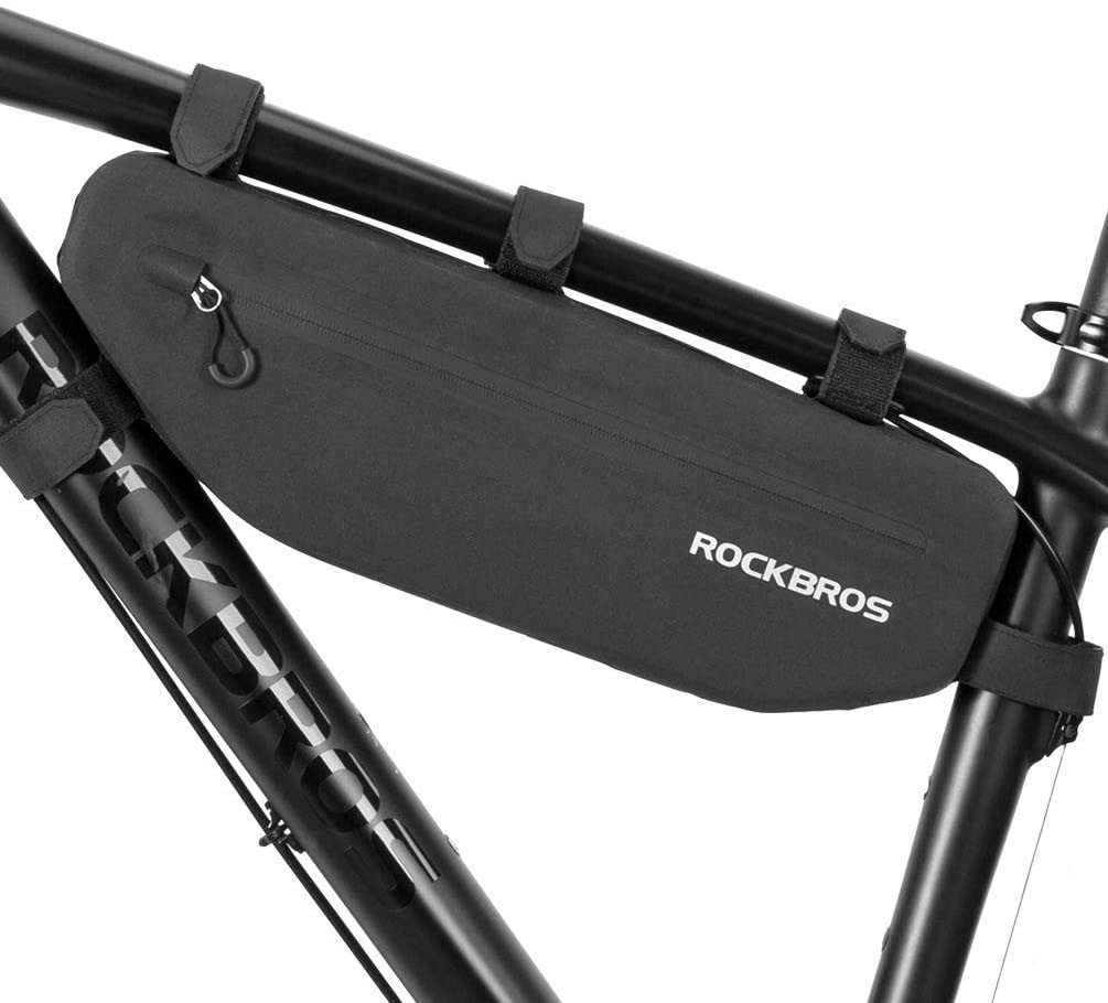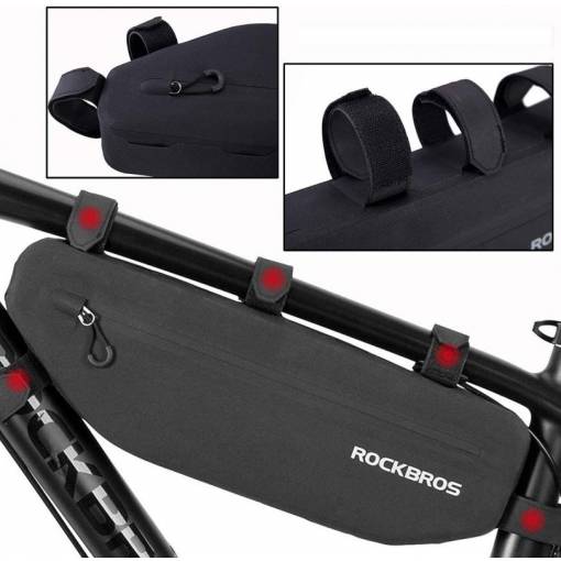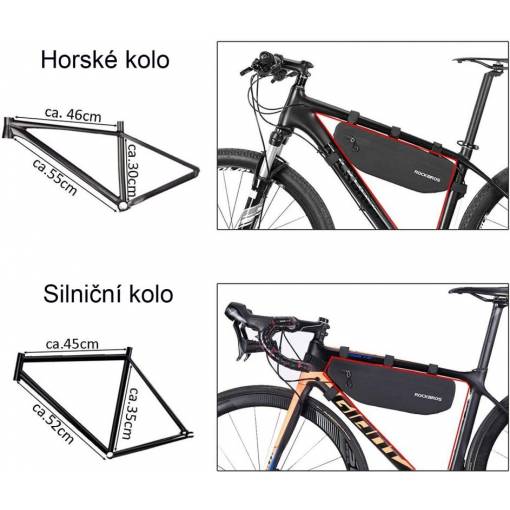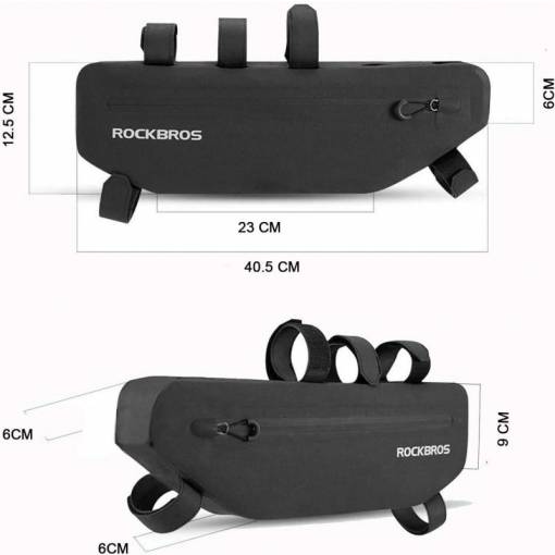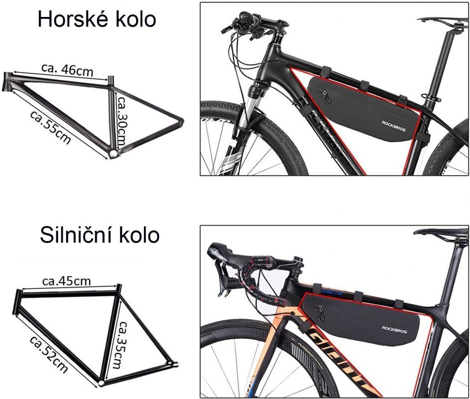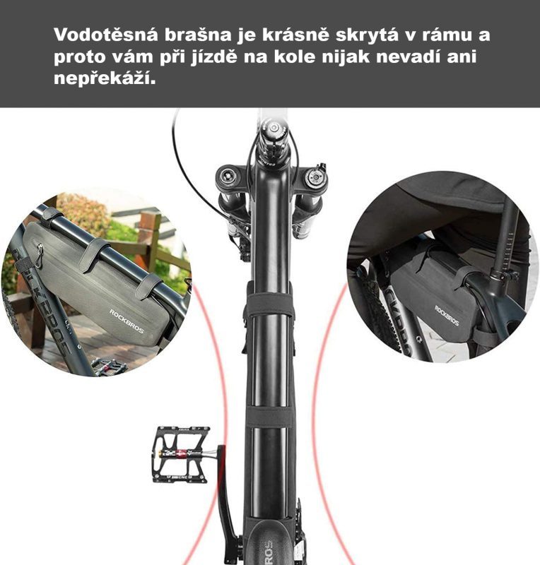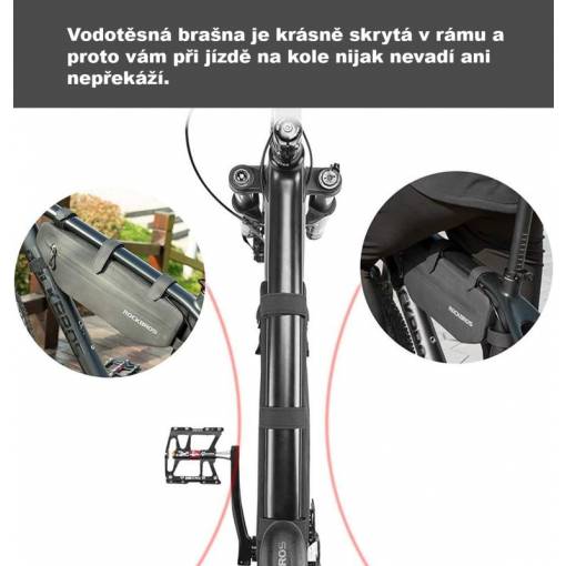 Jednoduchá instalace: Pomocí pěti nastavitelných suchých zipům brašnu jednoduše připevníte mezi horní a sedlovou trubku kola. Díky šířce pouhých 6 cm Vám při jízdě nebude překážet.