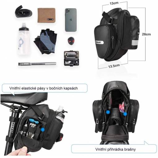 V obou postranních kapsách brašny se nacházejí elastická poutka, pro přehledné uložení nářadí na opravu kola apod. Zadní kapsa se stahovací šňůrkou je vhodná např. pro umístění láhve s pitím.