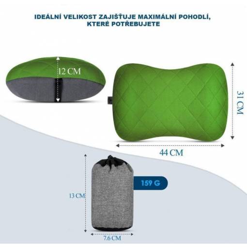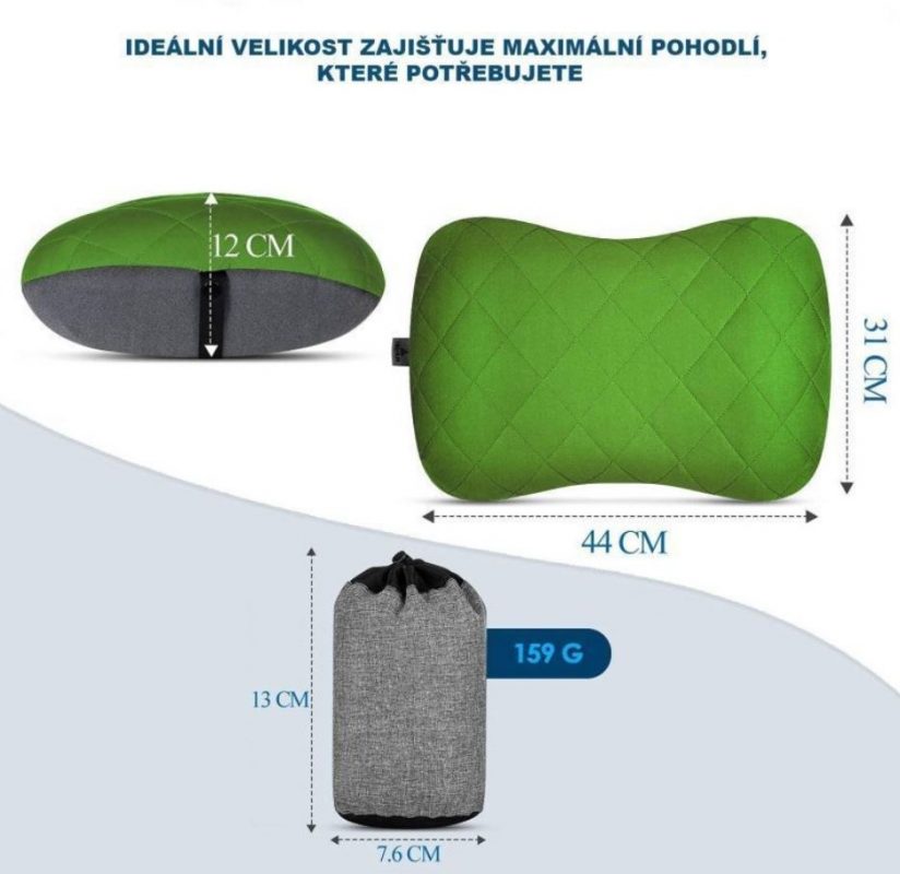 Lehký a kompaktní: Polštář váží pouhých 159 gramů. Součástí balení je praktický sáček pro snadné uložení a transport.