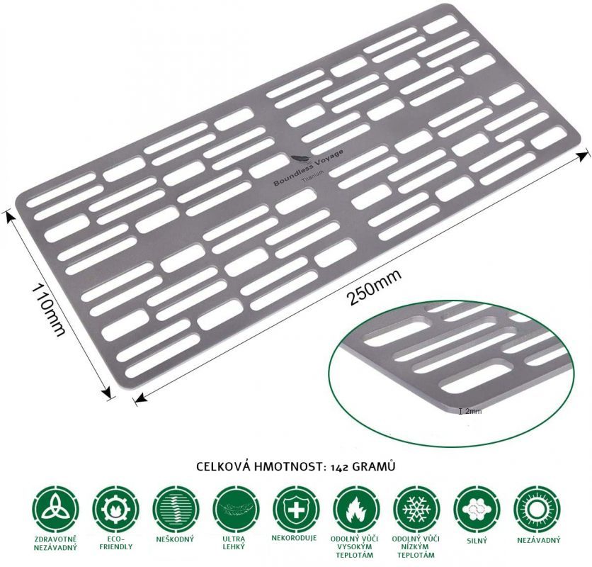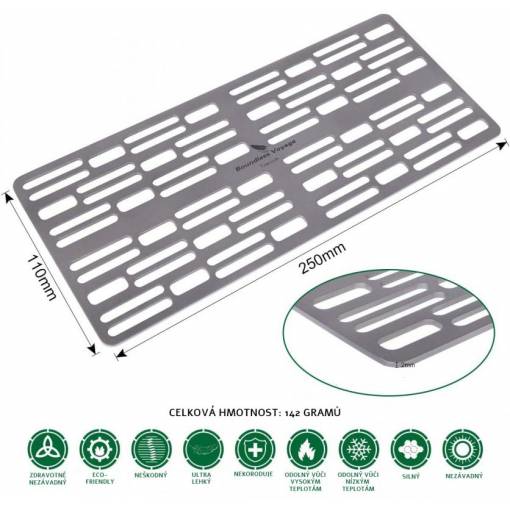 Lehký a přenosný: rošt měří 250 x 110 mm, jeho tloušťka je 2 mm a váží pouhých 142 gramů. Byl speciálně vyvinut odborníky na bushcraft a expediční camping.