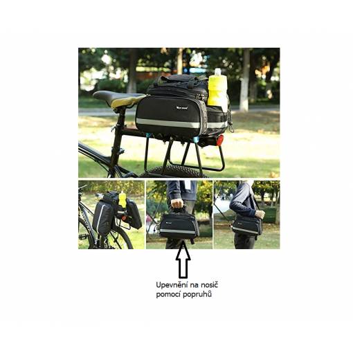 Brašna je určena k upevnění na zadní nosič kola, a to pomocí suchých zipů na její spodní straně.