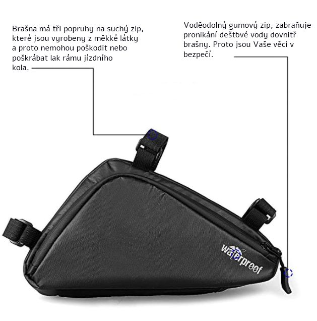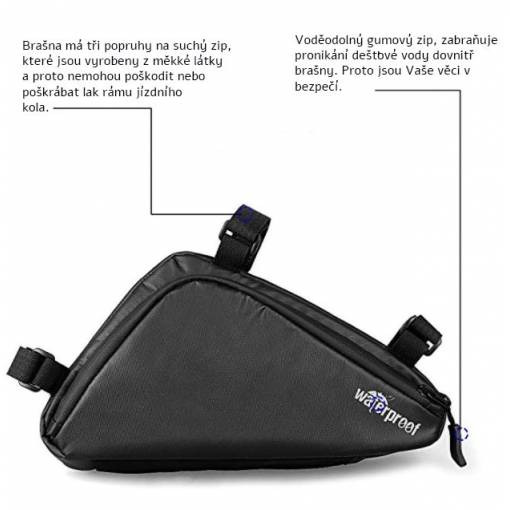 Brašna má tři popruhy na suchý zip, kterými ji lze snadno a rychle upevnit k rámu kola.
