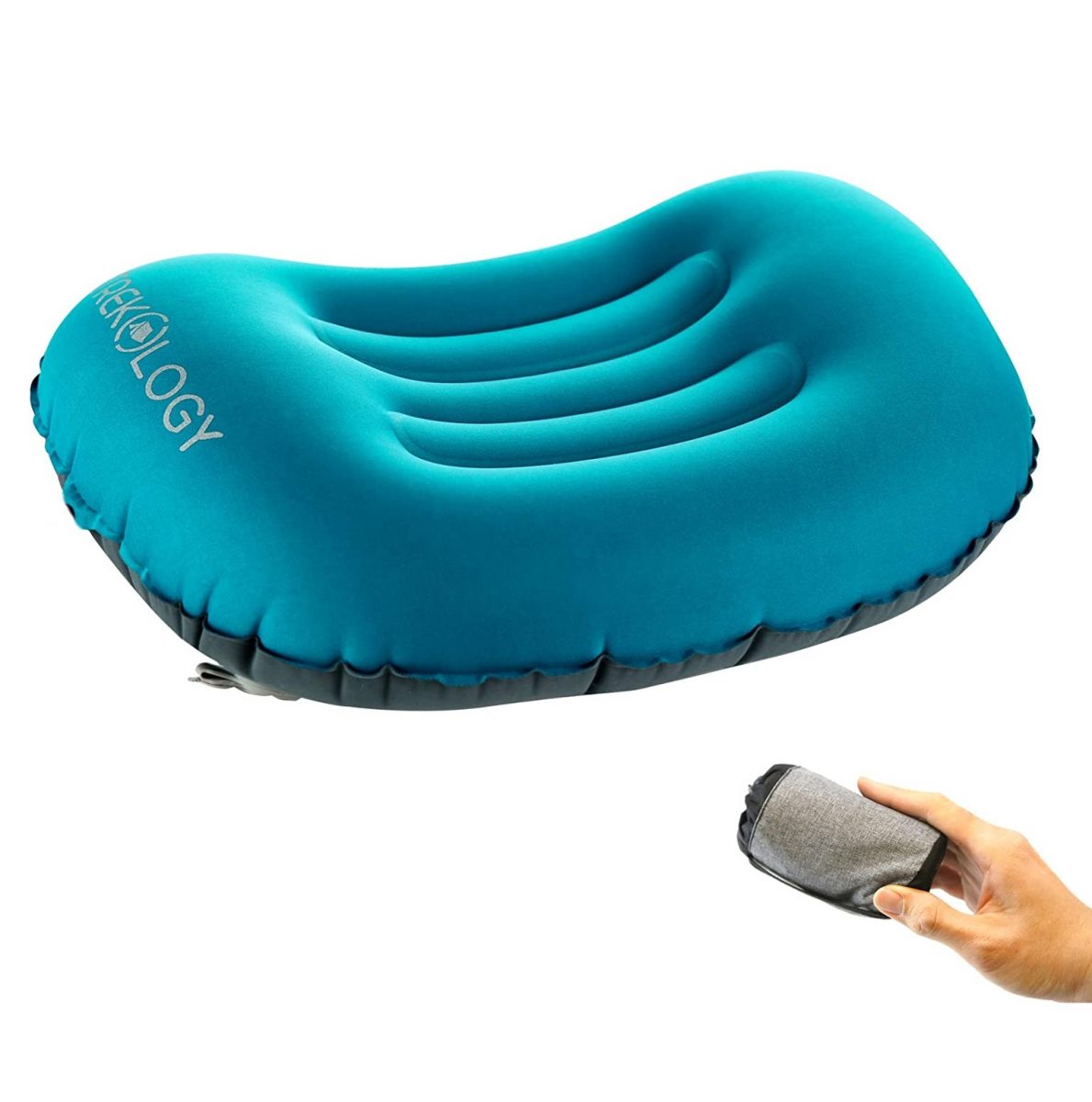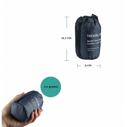Nafukovací polštář Trekology vyniká svým ergonomickým designem, kompaktními rozměry (12,6 x 5 cm) a nízkou hmotností (110 gramů).