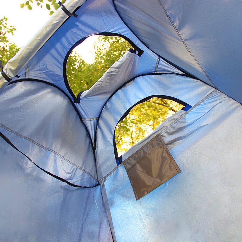 Pro účely sprchování má stan na vrchu a zadní straně otvor na zip, kterým lze dovnitř protáhnout sprchovou hlavici.