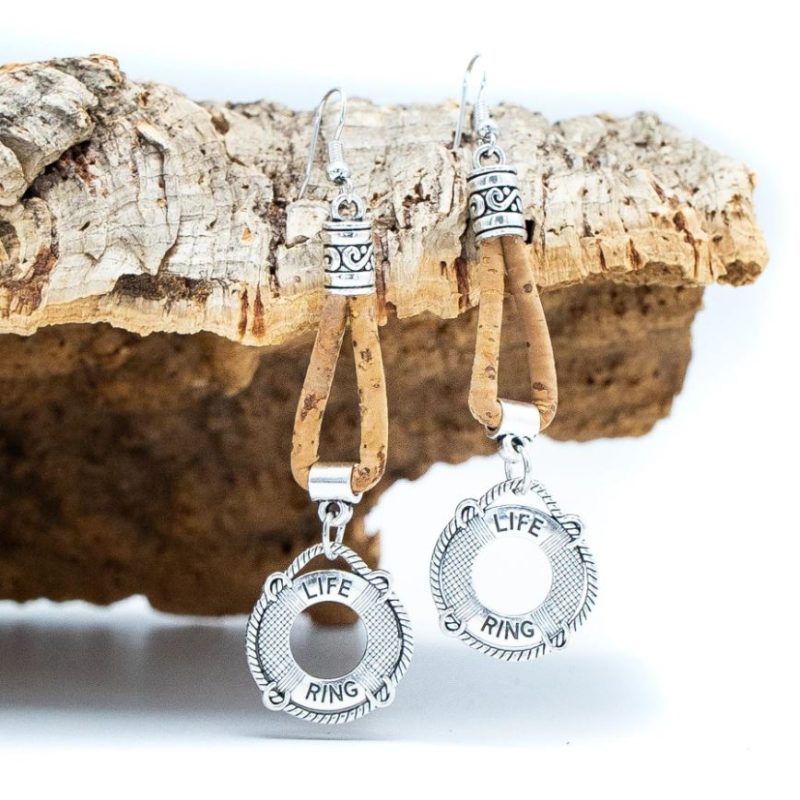 Korkové náušnice s kovovým přívěskem ve tvaru záchranného kruhu.
