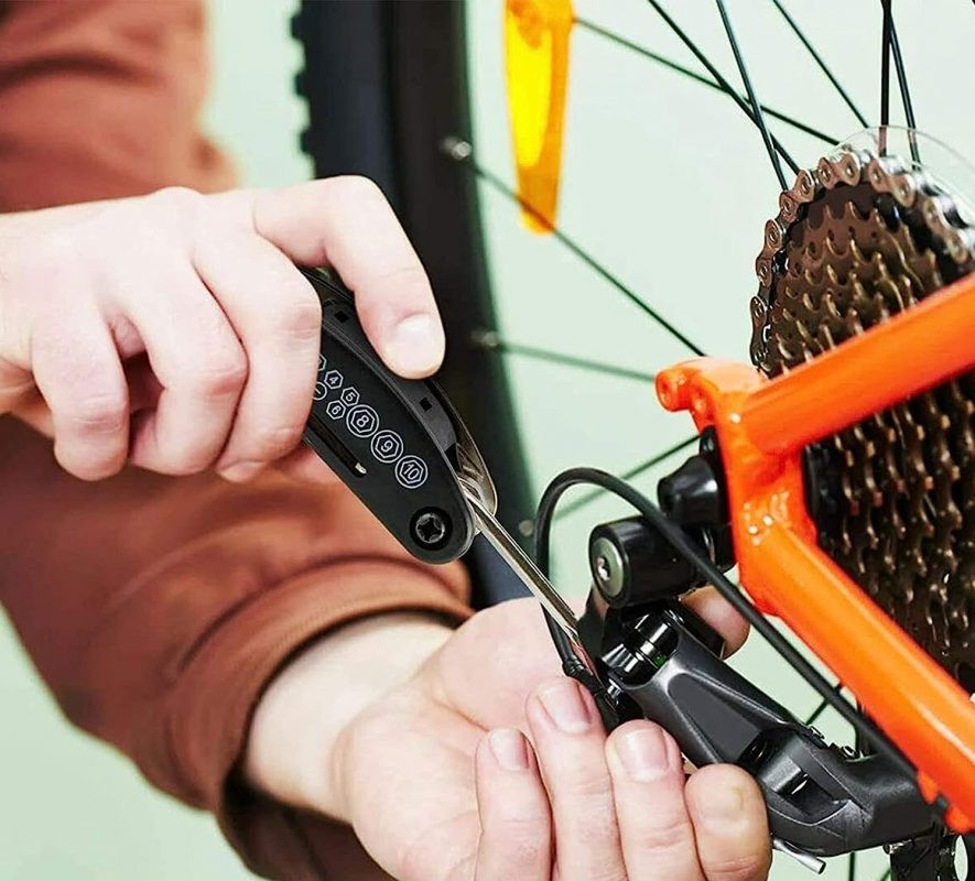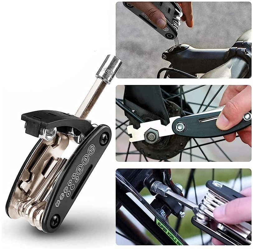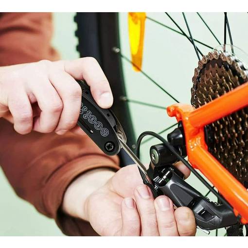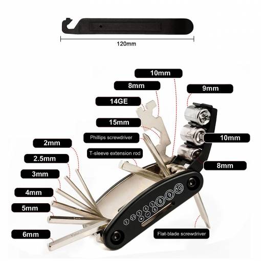 Multifunkční klíč nabízí 16 nástrojů v jednom kompaktním, odolném těle, které v případě nouze pokryjí všechny potřeby pro opravu kola (viz obrázek)