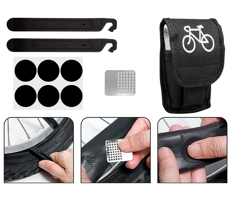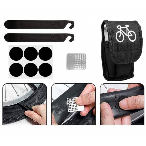Sada dále obsahuje 2 plastové montážní lžíce na pneumatiky, 6 samolepících záplat (každá 25 mm), 1 kovový pilník a praktickou taštičku s poutkem k upevnění na pásek.