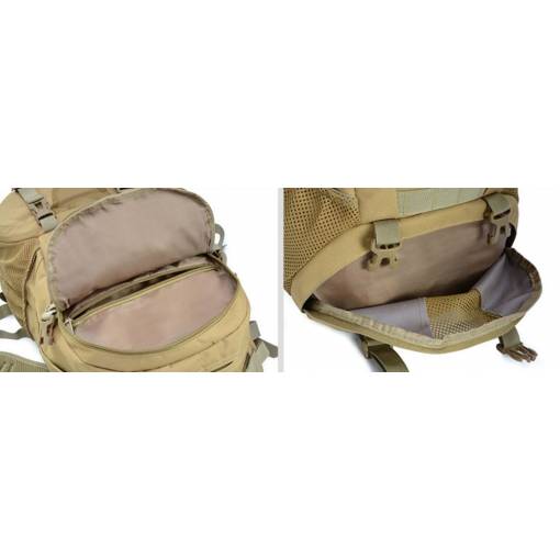MOLLE vazba: Hlavní výhodou tohoto batohu je několik řad univerzální MOLLE vazby, kterou je možné použít k připevnění mnoha dalších taktických pouzder, tašek a kapes. Tímto systémem je opatřeno čelo batohu.