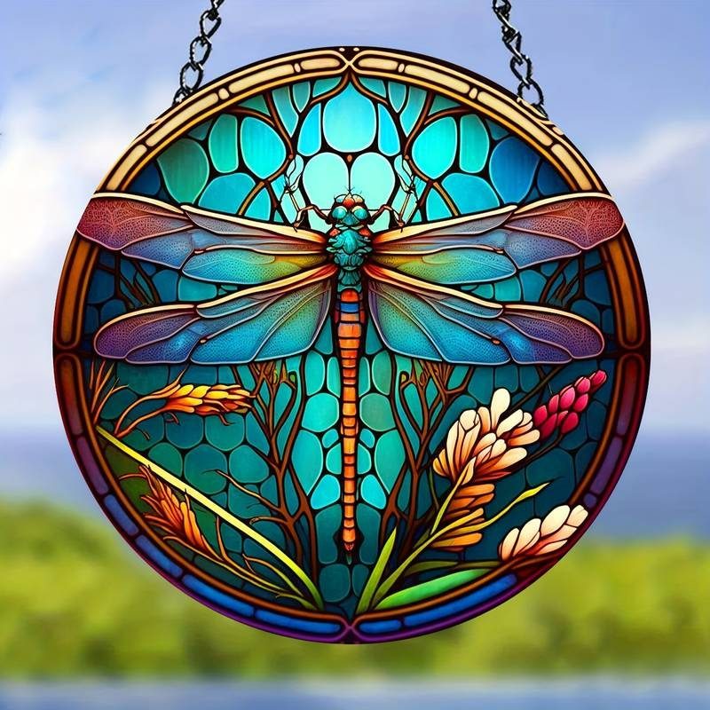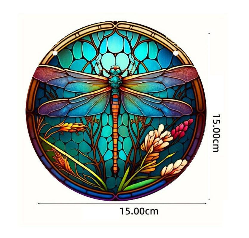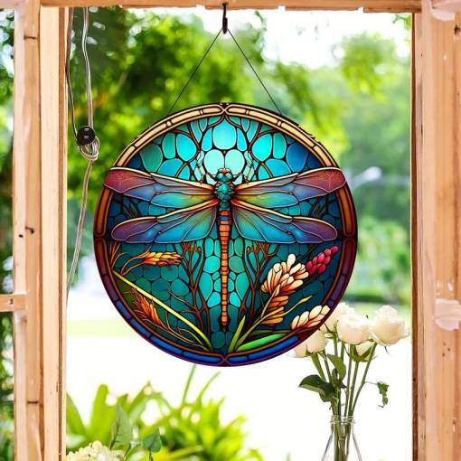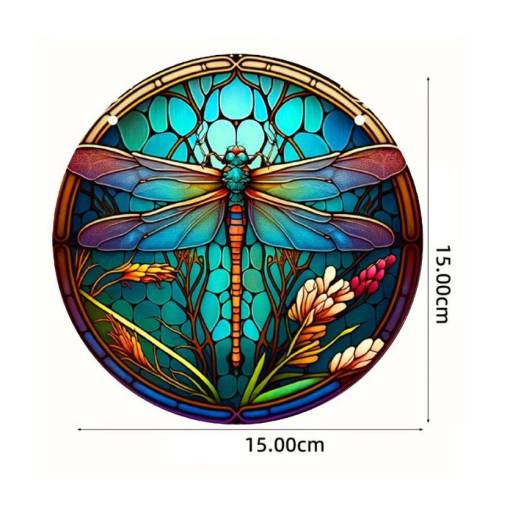V balení je závěsná kulatá vitráž s průměrem 15 cm a závěsný řetízek.