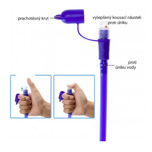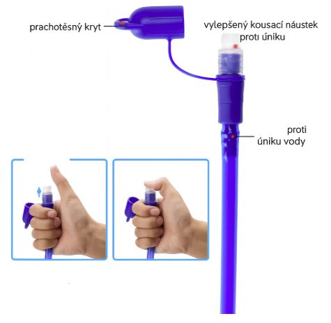 - Našroubujte závit na konci hadičky na konektor hydrovaku. Odejměte kryt náústku a vložte mezi rty. Průtok vody lze ovládat usrkáváním / lehkým kousnutím do náústku.