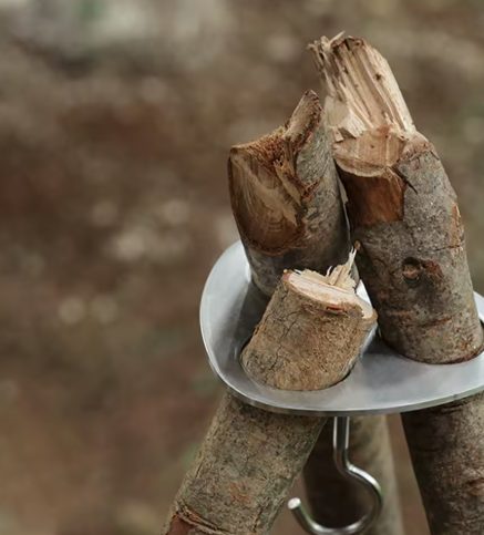 1. Rozložte tři větve do stabilního trojúhelníkového stojanu na rovné ploše poblíž ohniště.