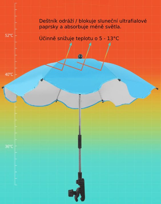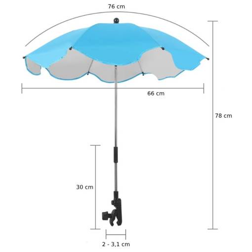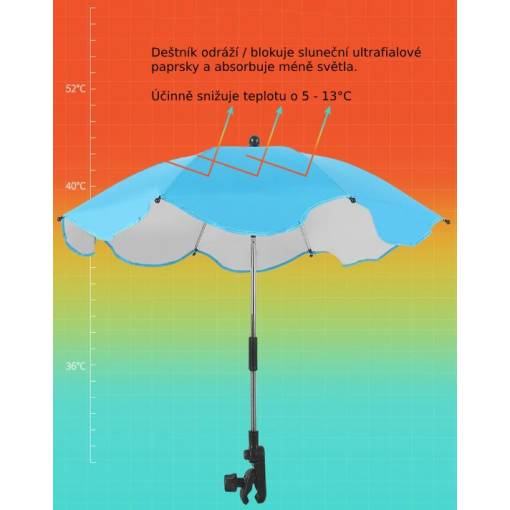 Deštník je navržen s kompaktními rozměry, takže se snadno přenáší, a poskytuje dostatek stínu. Je ideální pro použití na pláži nebo při upevnění na kočárek.