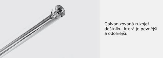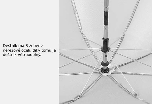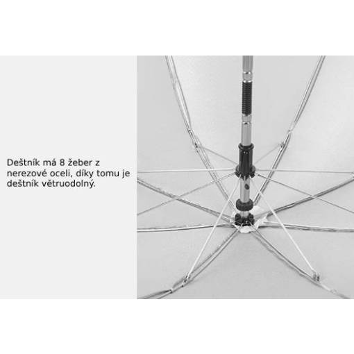 Deštník je vybaven konstrukcí z nerezové oceli, která je velmi odolná vůči korozi, což zajišťuje dlouhou životnost i při častém používání ve venkovních podmínkách.