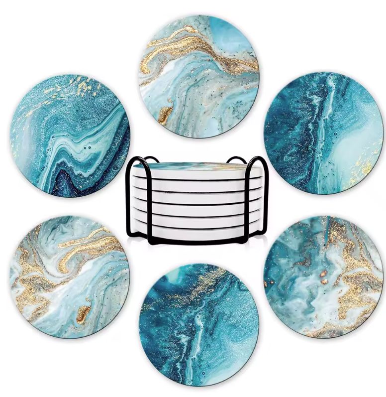 Dodejte svému stolu styl a eleganci s touto sadou keramických podtácků v moderním modrém mramorovém designu. Podtácky nejen skvěle vypadají, ale zároveň spolehlivě chrání váš nábytek před skvrnami, vlhkostí a poškrábáním.