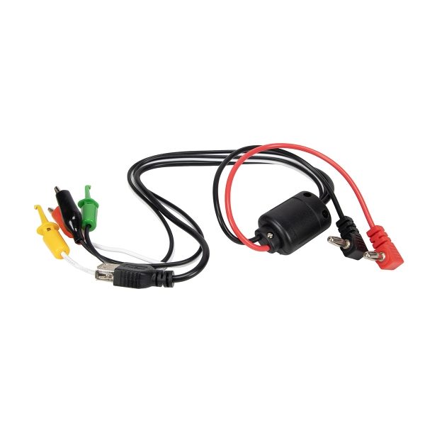 Výstup je realizován dvojicí 4mm banánových zdířek. Součástí balení je kabel s banánky, který rozšiřuje výstup o krokosvorky a háčkové sondy.