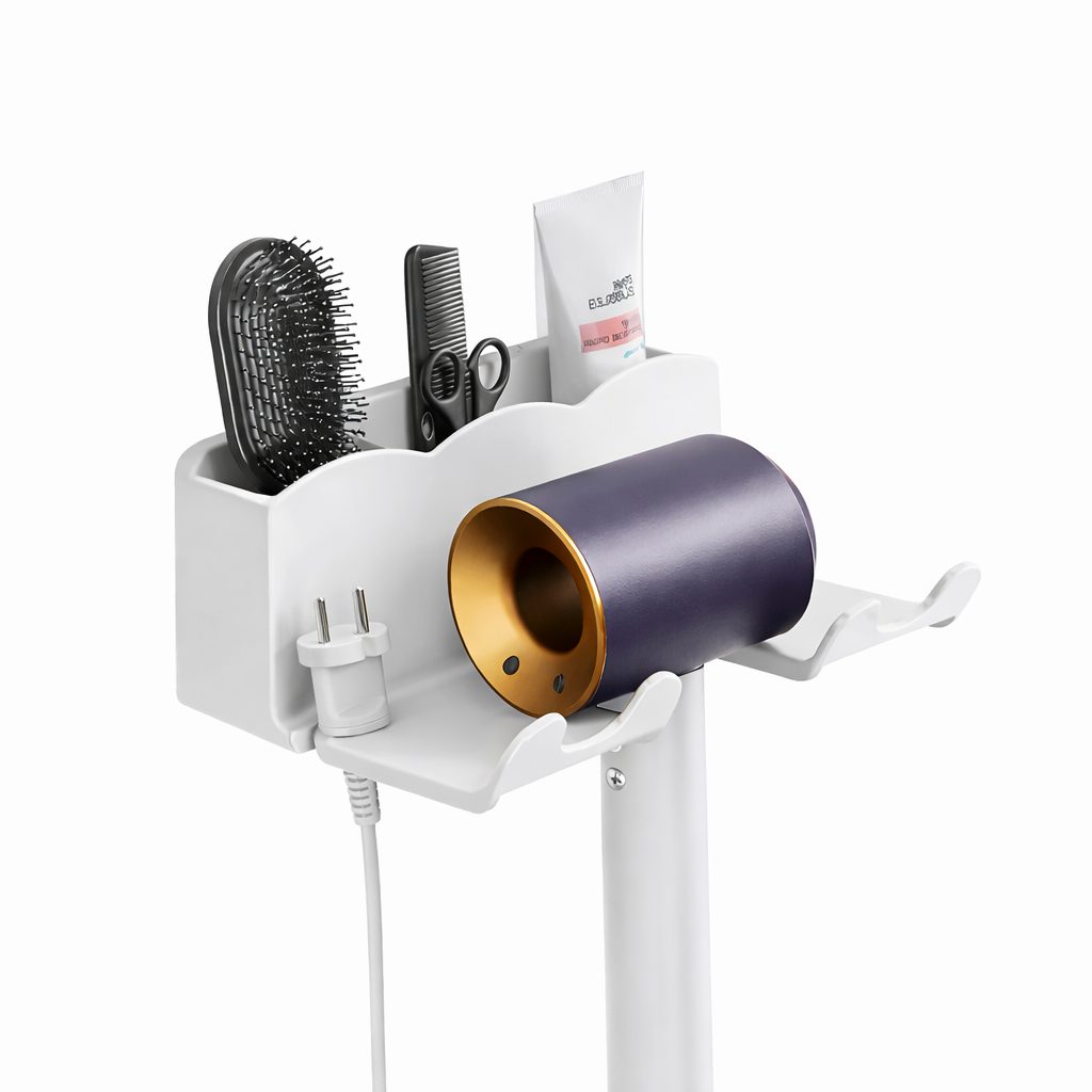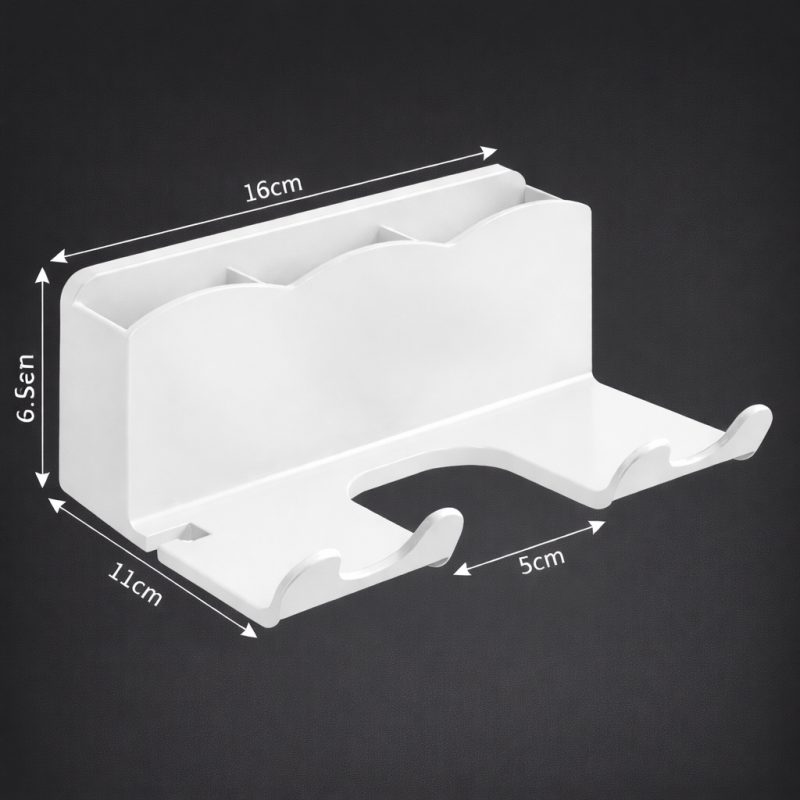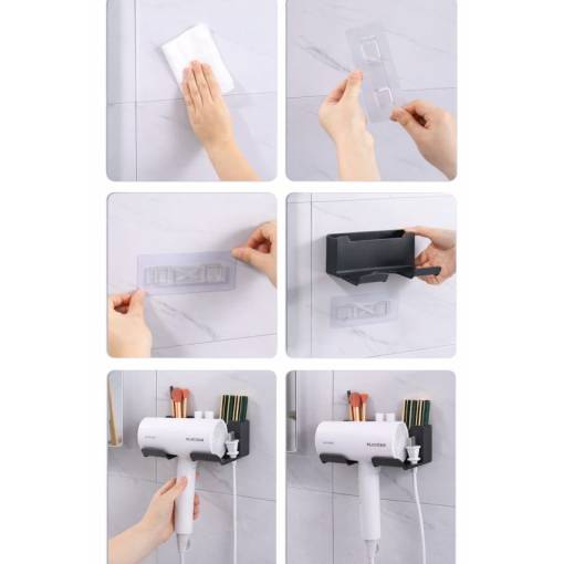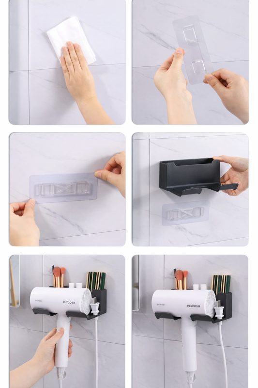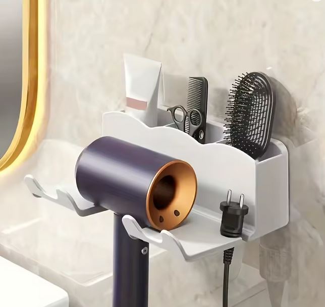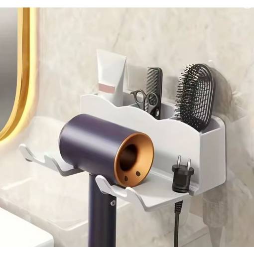 Praktický nástěnný držák na fén vám pomůže udržet koupelnu přehlednou a organizovanou. Díky montáži bez vrtání jej snadno připevníte na stěnu bez poškození obkladů.
